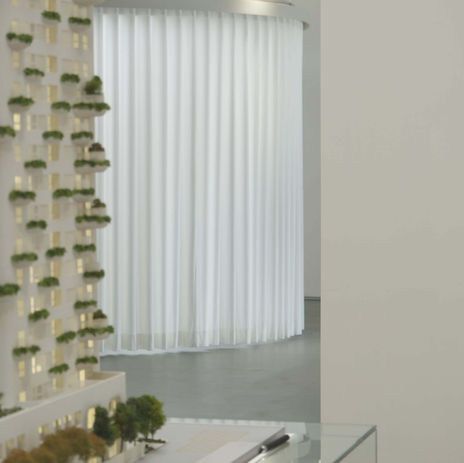 Greenery extends beyond the arched glass, while the gentle drape of curtains transforms the space into a shifting stage for performance, dialogue, and repose. Hidden walls serve as both portals and interfaces within this shell—where light defines the palette, and curves write the order.